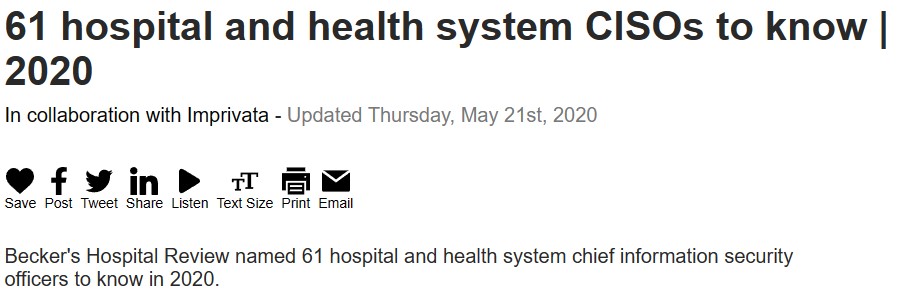 Becker’s Hospital Review named 61 hospital and health system chief information security officers to know in 2020.